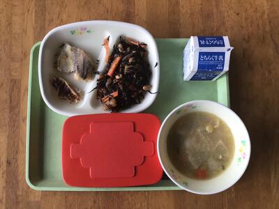 今日の給食は、ご飯、牛乳、タラのもみじ焼き、五目煮、根菜のごま汁でした。今日はお魚ランチです。お魚だけでなく、五目煮もごま汁も美味しかったです。