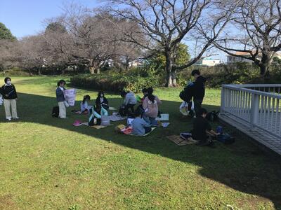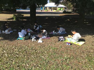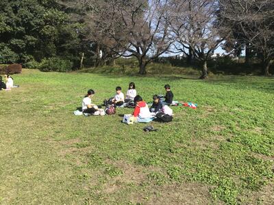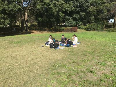 その後、天気が良かったので、外で班ごとにお弁当を食べました。