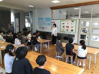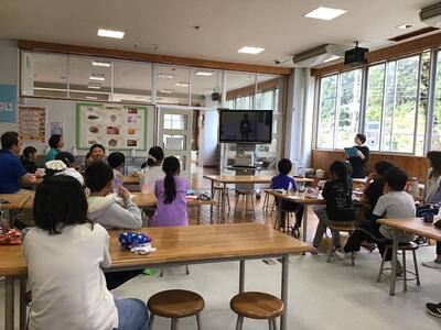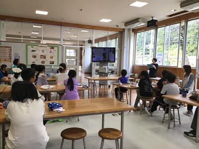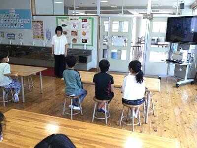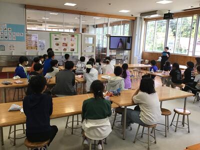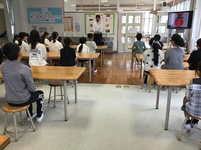 本日の給食後、5年生が作成したエプロンの紹介をする動画が上映されました。それぞれ工夫した面があり、上手に発表していました。見ていた児童も楽しみながら動画を見ていました。