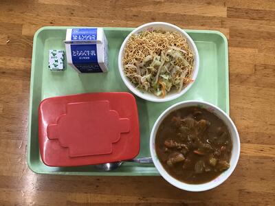 今日の給食は、もち麦ご飯、牛乳、ポークカレー、パリパリサラダ、ポケットチーズでした。今日は、サラダにカリカリの麺を入れて食べました。食感が楽しく、いつものサラダとは違う感じがしました。