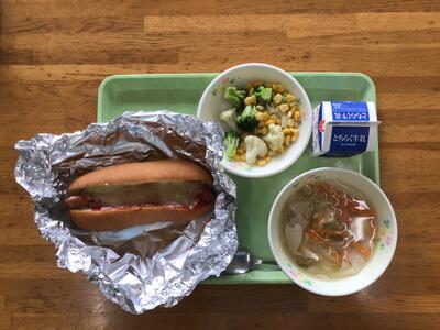 今日の給食はチーズホットドック、牛乳、花野菜サラダ、ワンタンスープでした。焼いたパンにチーズが入っていて、とても美味しかったです。