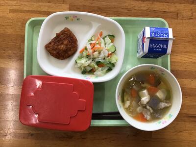 今日の給食は、ご飯、牛乳、タレカツ、そくせき漬け、さつまいも汁でした。タレカツは味がしみていて、とても美味しかったです。そくせき漬けもご飯によく合いました。さつまいも汁も、さつまいもの甘さが出ていて美味しかったです。