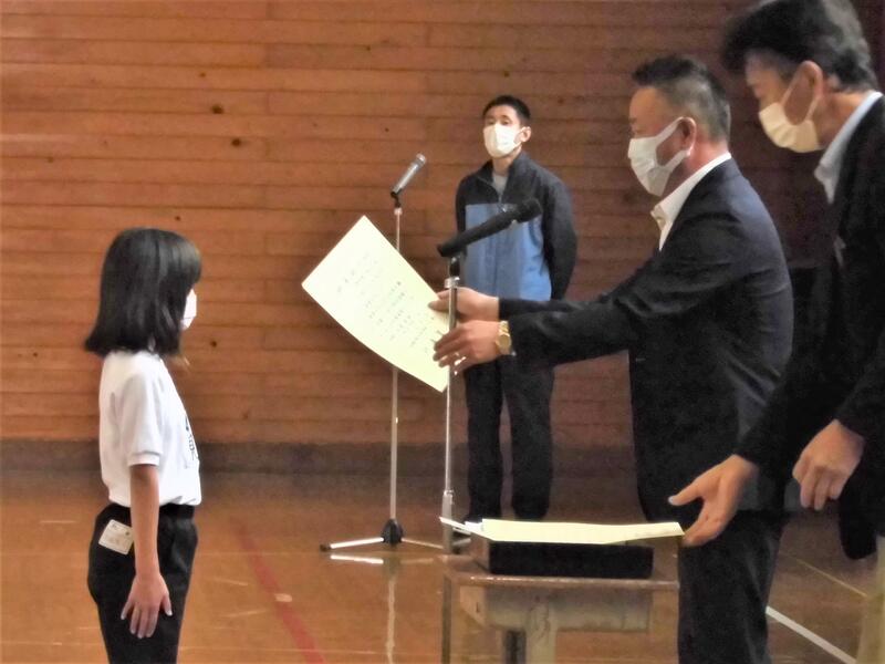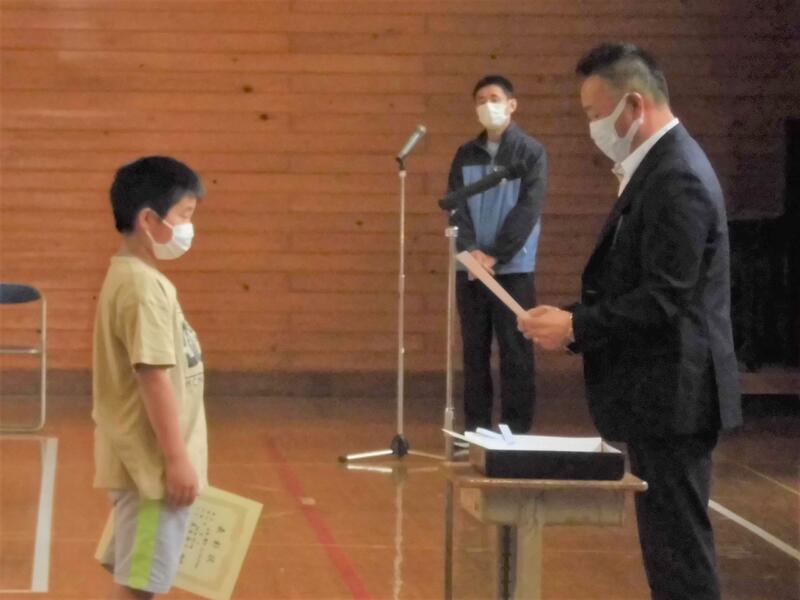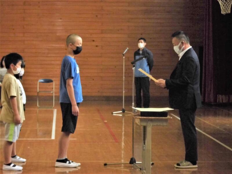 全校集会を実施しました。表彰伝達では、春季鹿沼市小学生陸上競技大会で活躍した子供たちに、賞状をわたしました。
