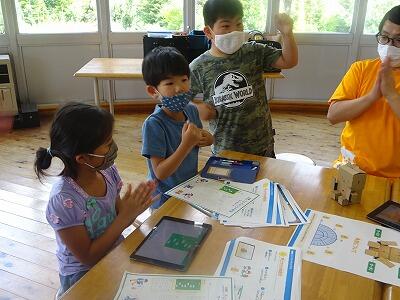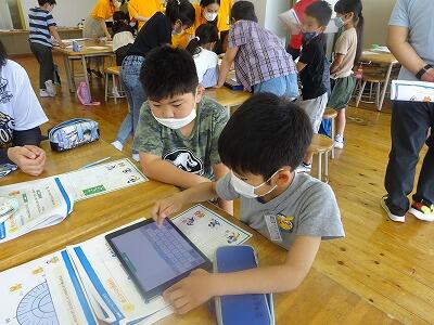 NTTdocomo様の協力を得て、2~4年生のプログラミング教室を実施しました子供たちは、タブレットを操作し、ダンボールのロボットを動かすプログラミングを体験しました。