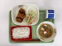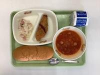 今日の給食は、ミルクパン、白身魚フライ、カリコリサラダ、ミネストローネ、牛乳です。ミネストローネはたっぷり入った具がよく煮込んであり、トマト味が染み込んでいておいしかったです。