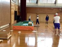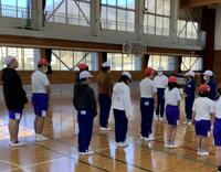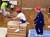 学校では3校時、5年生が不在のため、1〜4年生と6年生で合同体育の授業をしていました。授業の始めに、縄跳びで前跳び、交差跳び、あや跳び、二重跳びなどウォーミングアップをした後、跳び箱運動に取り組んでいました。いろいろな高さに設定された跳び箱の中から、自分が挑戦したい技に合った高さのレーンに並びます。跳び箱が一段高くなると、正面からの印象も高く感じるので「一歩前に出る勇気」が必要になってきます。児童は、安全に注意しながらも、何度も繰り返し挑戦していました。