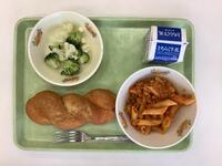 今日の給食は、ペンネマカロニのミートソース煮、きなこ揚げパン、イタリアンサラダ、牛乳です。きなこ揚げパンは、どの学校でも児童に大変人気のメニューです。今日はツイストパンにまぶしてありました。とてもおいしくて、人気メニューということに納得しました。
