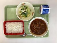 今日の給食は、ハヤシシチュー、ハムチーズサラダ、ご飯、牛乳です。ハヤシシチューはパンにも合いますが、今日の白米とも相性バッチリでした。