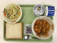今日の給食は【さつきランチ】インド煮、県産小麦食パン、県産いちごジャム、かんぴょう入りサラダ、県産ヨーグルト、牛乳です。栃木県産の食材をたくさん使った地産地消メニューでした。