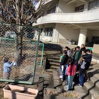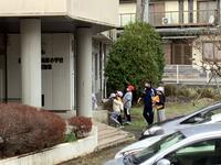 児童が、なかよし班ごとに校舎内外の安全点検をしている様子です。