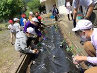 1・2年生が、さつまいもの苗を植えていました。1本ずつ丁寧に作業していました。