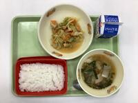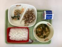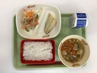 今日の給食は、魚のスタミナ焼き、ご飯、ごま和え、いなか汁、牛乳です。魚はサワラだそうです。いなか汁は、白菜、にんじん、じゃがいも、大根、こんにゃく、しめじ、生あげと、具だくさんで栄養たっぷりでした。