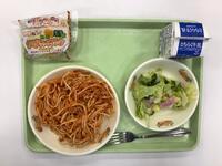 今日の給食は、スパゲティミートソース、ハムのマリネ、チーズドック、牛乳です。スパゲティは児童も満足のボリュームで、みな嬉しそうに食べていました。自然なトマト味で、体に優しい感じがしました。