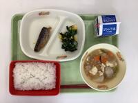 今日の給食は、さば味噌煮、ご飯、和風和え、きのこけんちん汁です。けんちん汁の味噌がいつもと違う赤味噌で、きのことよく合う味でした。