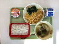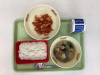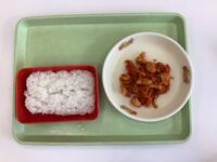 今日の給食は、わかめご飯、みそ汁、肉団子、きんぴらごぼうです。わかめご飯は本校でも人気の献立で、午前中から「今日はわかめご飯だ!」という声が聞こえてきました。