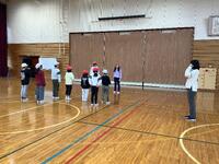 3校時の体育は、低学年と中・高学年の二手に分かれて行っていました。1・2年生は「ウルトラソウル」の曲に合わせて準備体操をしていました。ラジオ体操よりもリズミカルで激しい動きを1・2年生はよく覚えていて、曲に合わせて体をほぐしたり、腱を伸ばしたりしていました。その後、サーキット運動でケンケンパーやミニハードルなどを回っていました。ゴム段跳びは斜めになっていて、児童が跳ぶ高さを選べるようになっています。児童が楽しみながら運動に取り組み、目標や課題を自分で設定して意欲的に取り組む姿が見られました。