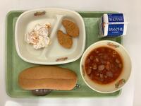 今日の給食は、ブラウンシチュー、バターロール、ハムチーズサラダ、牛乳です。ブラウンシチューはよく煮込んであり、濃厚でした。パンにつけても美味しかったです。