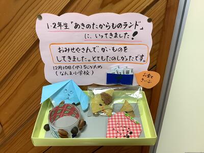 1・2年生は給食後、バスに乗って南摩小学校に行きました。今日は上南摩小・南摩小の1・2年生がなんま保育園の園児さんを招待し、「あきのたからものランド」を開く日です。今日のために、両校の1・2年生は準備をしてきました。開会式、交流、閉会式と、児童は「一歩前に出る勇気」を出して、司会進行やあいさつの言葉などがんばっていました。前半は児童と園児で交流を行い、後半は学校運営協議会委員さんも参加しました。児童は、お店屋さんを開く人とお客さんに分かれて楽しそうに活動していました。こちらが「何を売っているのですか?」「これは、いくらですか?」と聞くと、「ブレスレット屋さんです。1個100円です!」と、はっきり答えてくれました。