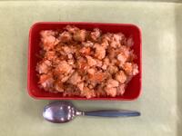 今日の給食は、チキンライスの具、ご飯、ミートボールスープ、牛乳です。チキンライスの具をご飯に混ぜ込んでセルフチキンライスを作るとのことで、実際に混ぜ込んでみました。