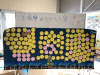 読み聞かせのあと、なかよし班に分かれて「キラキラカード」の掲示物を作りました。「キラキラカード」は、友達のよいところや優しいところなどをあらかじめ書いておいたものです。班でカードを集結させて、夜空の台紙に貼っていきました。3枚合わせて「上南摩小のキラキラ星」が完成しました。これは昇降口に飾ってあります。