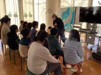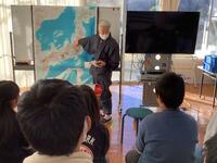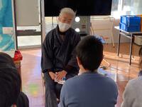 昔、佐渡島に猫好きのおばあさんがおり、三毛猫をかわいがっていました。貧乏暮らしで食事もままならない中、その猫には食べ物をやる中、猫は姿を消してしまいました。寂しがっているおばあさんの元に、美しい娘が訪ねてきて「私はあの三毛猫です。御恩返しに、私を奉公に出してお金を得てください。」とおばあさんにお願いして、「おけさ」と名乗って自分で三味線を弾きながら歌い、店は繁盛した、というお話です。この歌が「おけさ節」と呼ばれるようになったそうです。児童は静かにお話を聞いていました。
