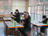 1・2校時は、3・4年生の授業です。4年生は「らん」を練習しました。「ひらがなの曲線が難しいです。」と、余白に何度も練習していました。先生からは「筆を立てて書こう。」「いい形に書けたね。」と、たくさんの助言や励ましのお言葉をいただきました。児童は、もっと上手に書きたい、という気持ちが伝わってきました。