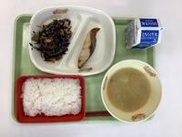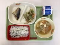 今日の給食は【お魚ランチ】さばのみそ煮、おかか和え、里芋と大根のそぼろ煮、ご飯、牛乳です。青魚のサバは脳の働きをよくする脂質や、体を作るたんぱく質が多く入っているそうです。みそ煮は和食の定番ですね。