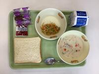 今日の給食は、フルーツクリーム、コッペパン、大豆ナゲット、ポトフ、牛乳です。コッペパンにクリームを挟んで、セルフフルーツクリームサンドができました。大豆ナゲットは、見た目の予想で食べると「あれ?甘いぞ!」となり、大豆の甘味と風味を感じて枝豆のような感覚でした。ヘルシーナゲットでおいしかったです。