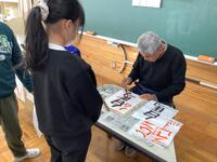 習字の先生が来校し、書道をご指導いただきました。45度で入る始筆や折れる時の筆の角度など、具体的にご助言いただけるので、児童は助言を次に生かして何度も挑戦していました。「この画がいいね。」と朱墨で花丸をつけてもらい、児童は笑顔になりました。上達した部分を賞賛してくださるので、児童は意欲をもって次々と半紙をセットして書いていました。