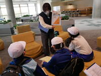 職員の方から施設の説明がありました。2階メイン広場から、3人は海の景色を眺めていました。