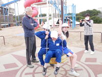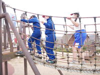 館内オリエンテーリングが早く終わったので、指導員さんの許可を得て、外の大アスレチック広場にある「海浜丸」で遊びました。3人貸し切り状態の海浜丸で、思い切り体を動かして楽しい時間を過ごしました。3人はとても仲が良いことが伝わってきました。
