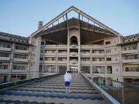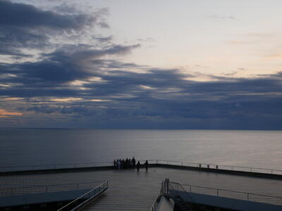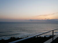 日の出前の海が、一面に広がっている幻想的な景色です。長い通路を歩くと、宿泊している生活館が見えます。本校5年生は今回、3階に宿泊しました。