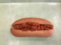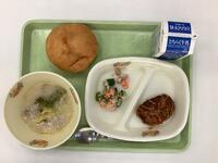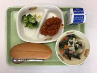 今日の給食は、スラッピージョー、コッペパン、チーズサラダ、ラビオリスープ、牛乳です。いつものように、切れ目の入ったパンに具を挟みました。おいしかったです。