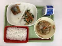 今日の給食は【お魚ランチ】さばのみそ煮、おかか和え、里芋と大根のそぼろ煮、ご飯、牛乳です。青魚のサバは脳の働きをよくする脂質や、体を作るたんぱく質が多く入っているそうです。みそ煮は和食の定番ですね。