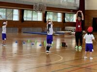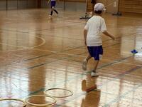 3校時の体育は、低学年と中・高学年の二手に分かれて行っていました。1・2年生は「ウルトラソウル」の曲に合わせて準備体操をしていました。ラジオ体操よりもリズミカルで激しい動きを1・2年生はよく覚えていて、曲に合わせて体をほぐしたり、腱を伸ばしたりしていました。その後、サーキット運動でケンケンパーやミニハードルなどを回っていました。ゴム段跳びは斜めになっていて、児童が跳ぶ高さを選べるようになっています。児童が楽しみながら運動に取り組み、目標や課題を自分で設定して意欲的に取り組む姿が見られました。