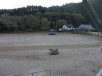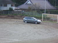 職員が自家用車で、金属製のならし器具を牽引して校庭整備を行っている様子です。