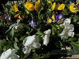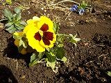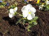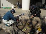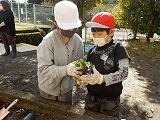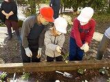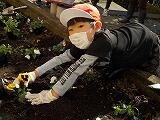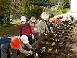 児童たちは外に飛び出し、花壇にパンジーの苗を植えました