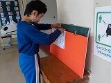 児童たちは掲示された昨年度の会場写真を参考に、5年生たちの活動指揮のもとで、机や椅子、掲示板の設置を進んでおこなうことができました。
