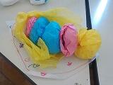 ハンバーガー、フライドポテト、ぞう、飛行機、鬼、クレープなど、薄紙に触れた感触や形や色をもとに、自由にイメージを広げて表したいことを形にした作品です