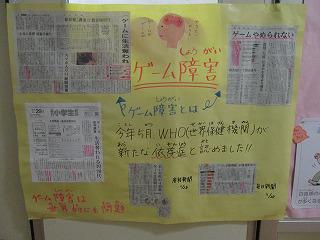 保健室の廊下に新聞記事が掲示されていました。11月28日・29日に報道された記事を使って「ゲーム障害」について紹介しています。ゲームをやっている子供たちもいるので、「やめられない」「ゲームに生活が奪われる」という記事は必要な情報だと思います。