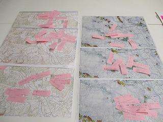 最初に、上南摩町付近の地図を見て、自分の家を探して丸をつけ、気づいたことを付箋紙に書いてもらいました。山に囲まれていることに気付いた子が多かったです。