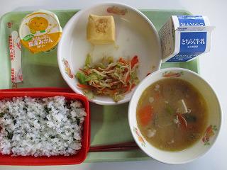 11月30日の給食の献立は、「牛乳・わかめご飯・豚汁・厚焼き卵・おかかあえ・みかんゼリー」で、栃木県産の食べ物の日でした。特に、厚焼き卵には「とちまるくん」の焼き印がついていました。卵も栃木県産を使っているからです。その他に、豚肉・もやし・だいこん・ねぎ・味噌も栃木県産でした。「とちまるくんが、かわいい」という声が聞こえました。