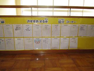 図書室前の掲示板を見ると、上南摩小の24名が今までに読んだ本の合計が表に記録されています。今年一年間の目標は2000冊でしたが、夏休みが終わって、1141冊が記録されています。また、その掲示板の隣には「おすすめする本」の紹介コーナーがあります。また、11月は「読書月間」として、様々な計画が立てられています。読書の秋です。今まで読んでいなかった分野の本などにもチャレンジしてほしいと思っています。