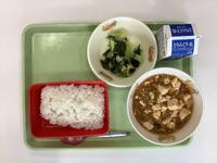 今日の給食は、マーボー豆腐、ご飯、海藻サラダ、牛乳です。寒い一日だったので、おいしいマーボー豆腐で体が温まりました。