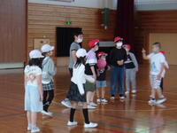 前回の投げる動きの実践です。チーム分けは学年ごとに、体を使った足じゃんけんで行いました。