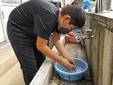児童たちは各自が用意したハンカチや靴下を、汚れの状態や洗剤の種類、水とお湯などに着目しながら実際に試して学んでいました。「これは部分的に固形を使ってみます。」「これはお湯の方がいいかなぁ」「布地が薄いからこれ以上は危険かも…」「洗剤を入れすぎるとダメだよ」などと様々な気づきの言葉が出てきました。