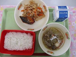 12月3日(火)の給食は「かるちゃんランチ」でした。献立は、「牛乳・ごはん・さばのスタミナやき・きりぼしだいこん煮・とりごぼう汁」でした。とりごぼう汁に入っていた「さといも」は南摩中で収穫したそうです。やわらかくて美味しかったです。