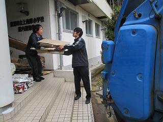 今日の昼休みに、学校で集めていた資源物を高学年の子供たちが体育館から運び出して、教職員がトラックに積み込む作業をしました。一年間集めていた段ボール・新聞紙・古本等が資源となり、児童会のお金にもなります。