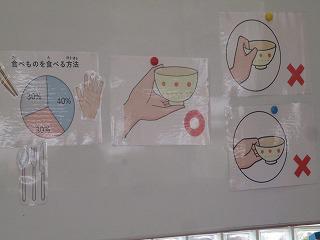 給食の後、食べ方が国の文化により異なる話を聞き、日本の食事のマナーとして、お茶碗の正しい持ち方を教えていただき、実際にやってみました。