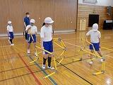 1・2年生は、ミニサークル等を使ってウォーミングアップを行い、その後は身体全体を使ってミミズや象になって動いてみました